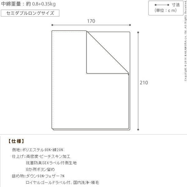 【仕様】 側地:ポリエステル80%、綿20%(高密度・ピーチスキン加工・抗菌防臭SEKラベル付) 詰め物:ダウン93%、フェザー7%(国内洗浄・精毛) 【サイズ】 170x210cm 重量:約3.4kg 株式会社ナカムラ(90400052)