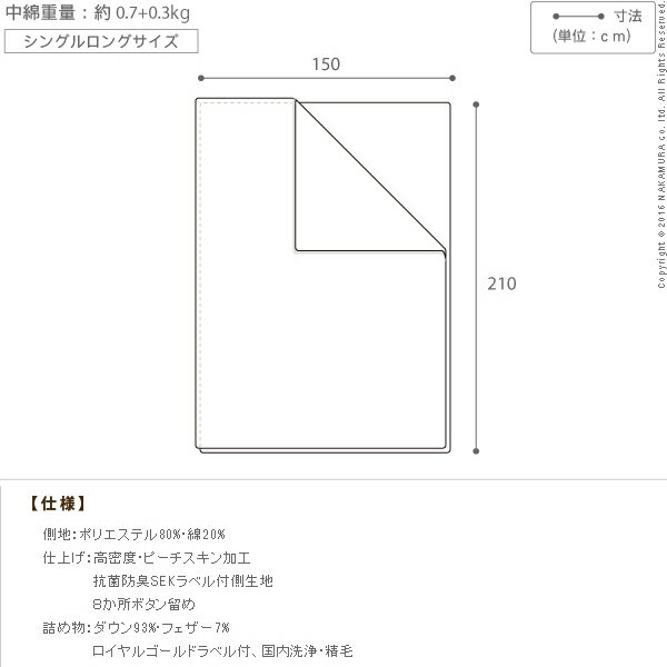 【仕様】 側地:ポリエステル80%、綿20%(高密度・ピーチスキン加工・抗菌防臭SEKラベル付) 詰め物:ダウン93%、フェザー7%(国内洗浄・精毛) 【サイズ】 150x210cm 重量:約3kg 株式会社ナカムラ(90400051)