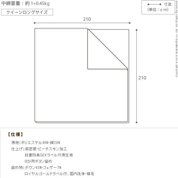 【仕様】 側地:ポリエステル80%、綿20%(高密度・ピーチスキン加工・抗菌防臭SEKラベル付) 詰め物:ダウン93%、フェザー7%(国内洗浄・精毛) 【サイズ】 210x210cm 重量:約4.2kg 株式会社ナカムラ(90400054)